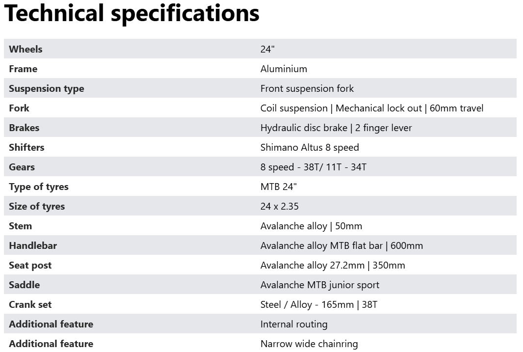 Ignite the racer within and chase every A line on your way to the podium. When thrill and agility combine, you get the Ignite. Designed with cutting-edge performance in mind, the Ignite is built to zoom through the neighbourhood and trails with its lightweight aluminium frame, slack head angle, low standover height and 8 speed drivetrain. The Ignite is a racer’s bike and doesn’t compromise on functionality. With a space for a single bottle, your little racer can stay hydrated on the go, ensuring they’re always fueled up for the next adrenaline packed adventure or pursuit of the podium. Safety at speed is paramount, and the Ignite delivers with hydraulic disc brakes that bring them to a controlled and swift stop. Elevate their cycling experience, spark their adventurous spirit, and let them race to their full potential aboard the Avalanche Ignite.